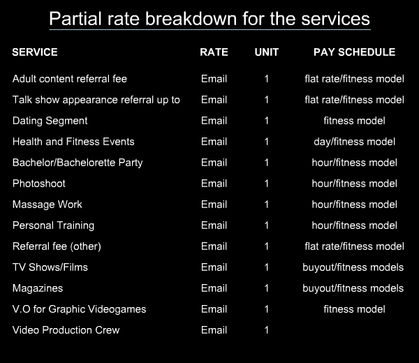 ServicesMad Media Online provides the following services below: V.O. (Voice-over) for graphic videogamesAdult Content Acting on screen for non adult videos/films Magazine shoots Massage work TV shows Guest talk show appearances Commercials Infomercials Fitness magazines Health and fitness events Healthy cooking segments for television, cable networks, and the internet Fitness apparel/athletic wear Sexy exercise videos Entertainment events Bodybuilding & Bikini Event Listings Bodybuilders & Muscle Worship Scenes Adult entertainment events (bachelor/bachelorette parties) (videotaped/non-videotaped) Photoshoots/Video shoots TFP (Trade-For-Print/Trade-For-Video) Fitness modeling for educational, corporate, or entertainment mediums Dating segments Fitness actors, Fit actresses, Fit Athletes, and Fit extras Promotional fitness modeling and acting (promotional fitness modeling events, healthy product modeling, waiters, brand ambassadors, abstract body part photography/videography, spokes models, waitresses, bartenders, performances, private shows, exercise videos, infomercials, and media-related events.) Personal training Private Skype sessions (the fitness model will give the client quick and healthy cooking and exercising tips/no nudity) Live Video Chat Fitness modeling/posing in artistic form (body painting) Private Muscle Flexing Sessions Private Light Wrestling Sessions Private Mixed Wrestling Sessions
